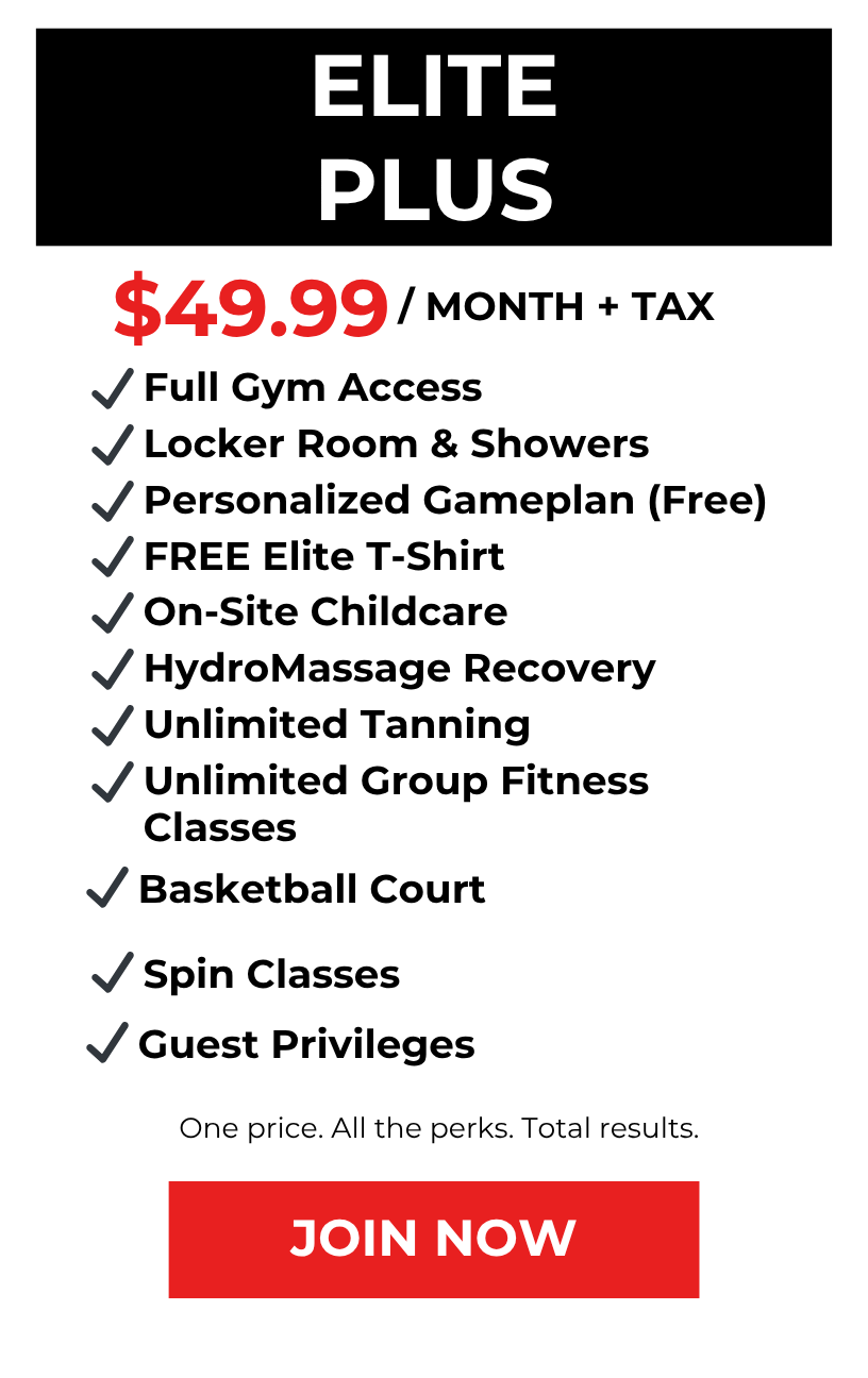 We offer Basic, Elite, and Elite Plus memberships. Each tier includes more perks, like classes, tanning, HydroMassage, and guest privileges (depending on location and plan).
